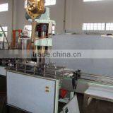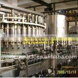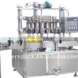 The machine is a device developed exclusively by modern pack machinery on the basis of digesting and absorbing domestic and international (still) pop can filling and seaming machine (sealing machines). It adopts the normal pressure filling principle. After it passes through the dialing wheel, the empty can will enter into the lift can supporting disc, and the filling valve is aligned with the empty can, which will rise for sealing. Meanwhile, the valve port of the filling valve is automatically opened. When the filling can will be conveyed to the sealing machine head by the hook chain. The cap will be sent onto the can mouth by the cap rises, the pressing head presses he can mouth, the sealing wheel carries out pre-sealing and then real sealing. After it is sealed, the can is pushed out by the beating head of the cap beating mechanism and then enters into the can discharging procedure.