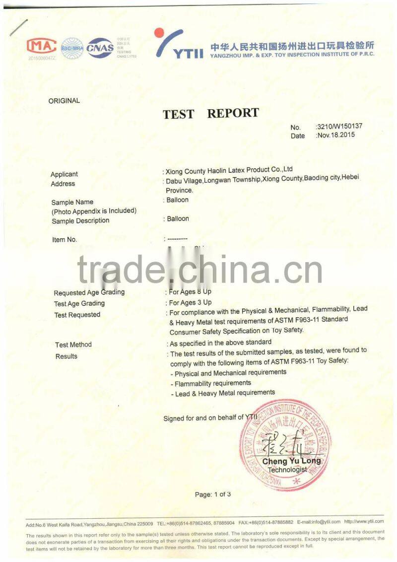 We are XiongXian Haolin Latex Products Co.,Ltd from China ,established in 2006 ,with ten years exporting experience to Middle east,European,South American ,southeast Asia and other countries .We mainly specialized in manufacturing round balloon,metallic round,heart shape balloon,LED balloon,Water balloon and shaped balloon .please feel free to visit us at: http://haolinballoon.en.china.cn
