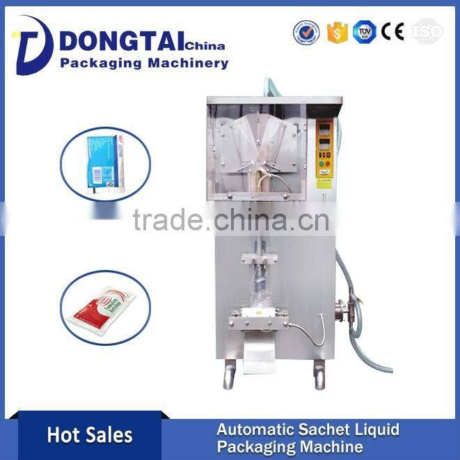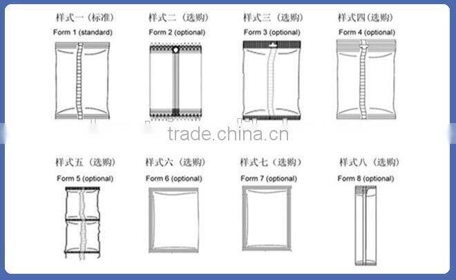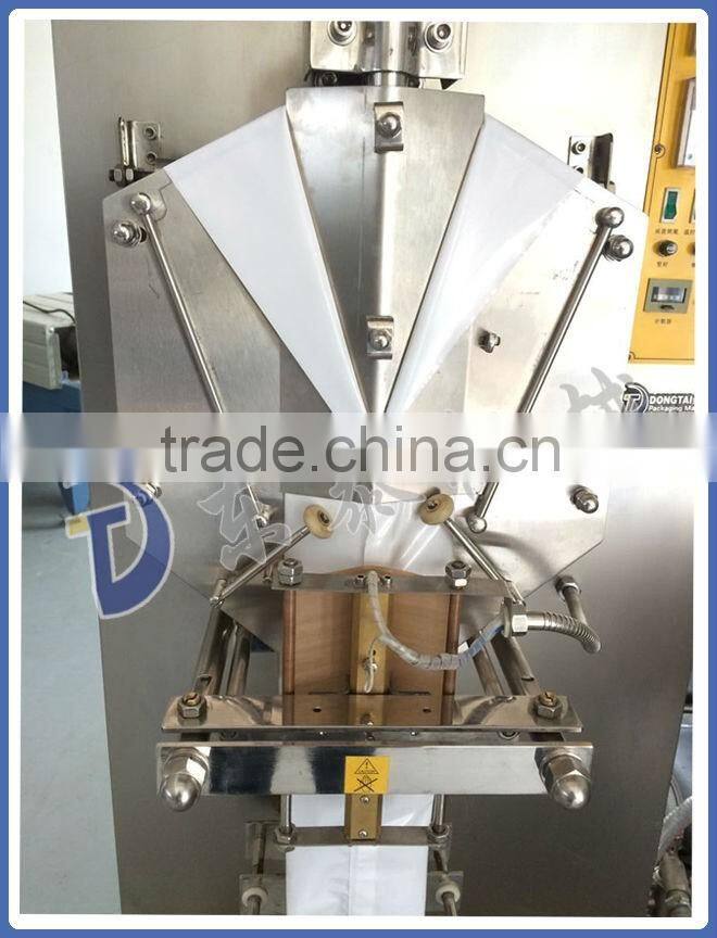The package machine is suitable for filling soy sauce, vinegar, juice, milk and other liquids, using 0.08 mm polyethylene film, automatic to compete the molding bag, quantitative filling, ink printing, sealing and cutting off process, and film using UV disinfection before packaged, in line with the requirements of food hygiene.