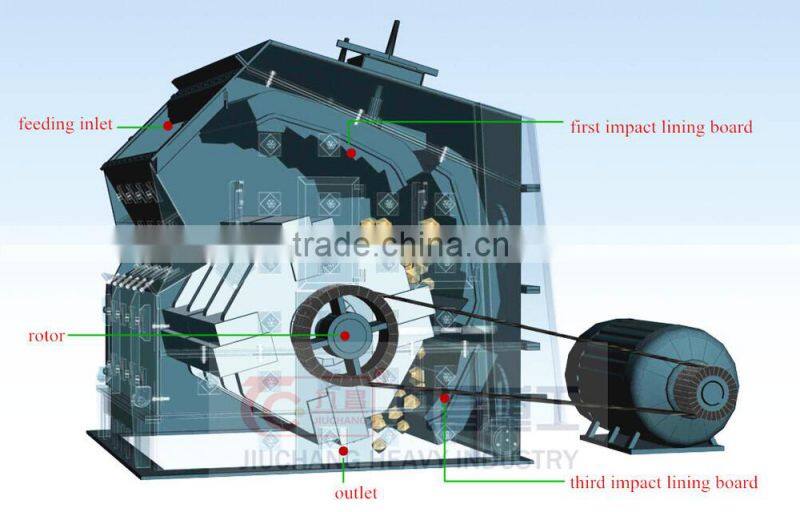 board hammer area, firstly hit by the rotor, then the material rebound to the impact lining board, thirdly