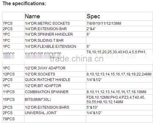 78 PCS Socket Set(1/4" &1/2")US$ 28 - 38MOQ: 10 Sets