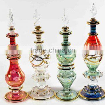 Mouth blown Egyptian glass perfume bottles with 14k gold lining made the same way glass products were made thousand of years ago. Our skilled artist hand engrave the thin glass by hand, color and line with pure gold.