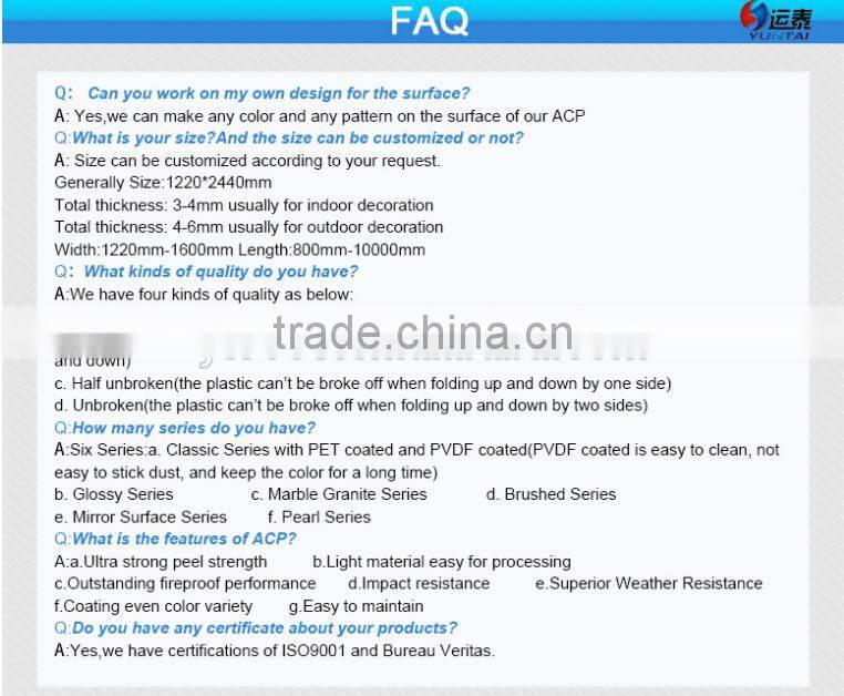 Aluminium composite panel is composed of a polyethylene core sandwied between two sheets of aluminium.And the surface of the aluminium-plastic composite panel is covered with a protective peel-off film.Our aluminium-plastic composite panel has distinguished features of super peeling strength,stron durability,fireproof,impact resistance with noise absorptive,multiple colors and coating evenness and it is easy to be processed. It can be widely used in galleries, exhibitions, saloons, offices, banks, hotels and many apartments.Other kinds of buildings: As ideal decorative materials for the outer-wall and inner-wall of buildings.Kitchen cabinets, billboards, signboards, tunels and subway interiors and others places.