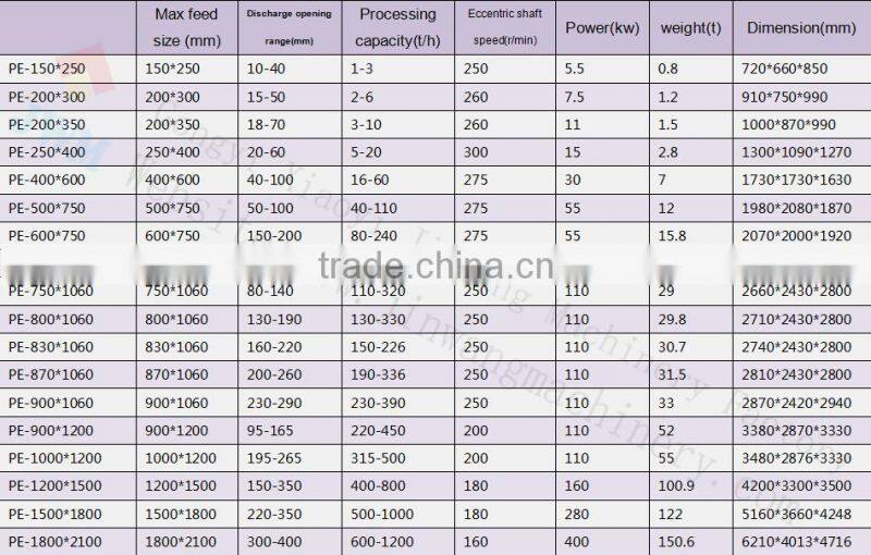 Jaw crusher, can be divided into large, medium and small size according to the treatmen capacity. The feed opening is composed of two jaw plates of moving jaw and jaw plate, which is a crushing chamber simulating the two jaw movement of the animals to complete the material broken. Widely used in mining, building materials, roads, railways and water conservancy in a variety of ore and bulk materials of medium or small particle size.