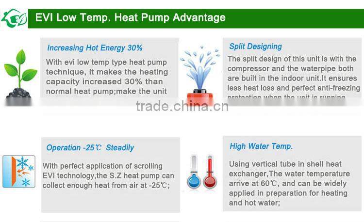 This EVI heat pump is specially designed for chilly climate areas.Its core philosophy is to solve the users' house heating and hot water supply during the very cold climate.