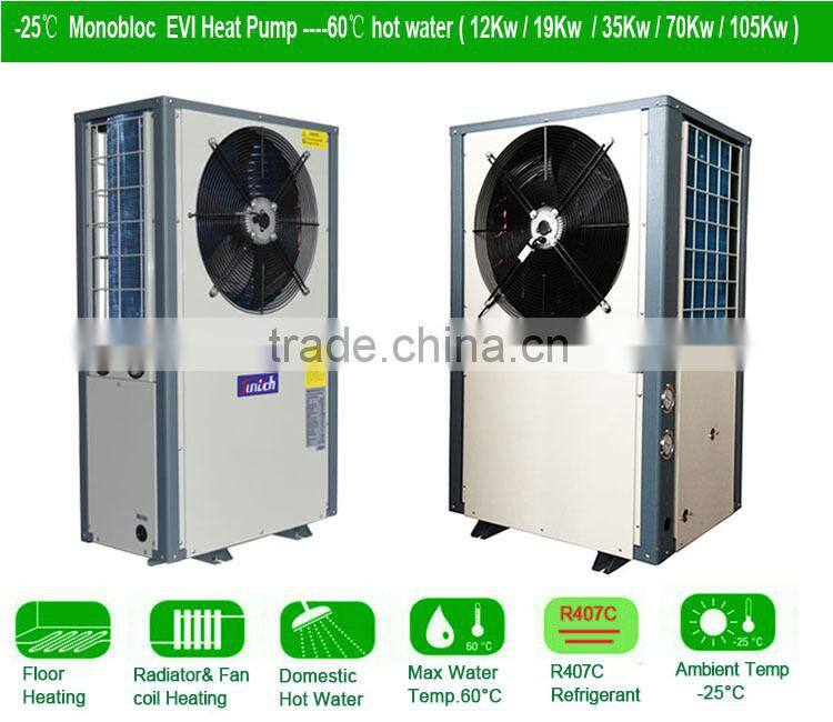 Europe -25C Cold Winter Using 12kw/19kw/35kw/70kw R407C Auto-defrost EVI Air Source Heat Pump Hot Water Home Heating Systems