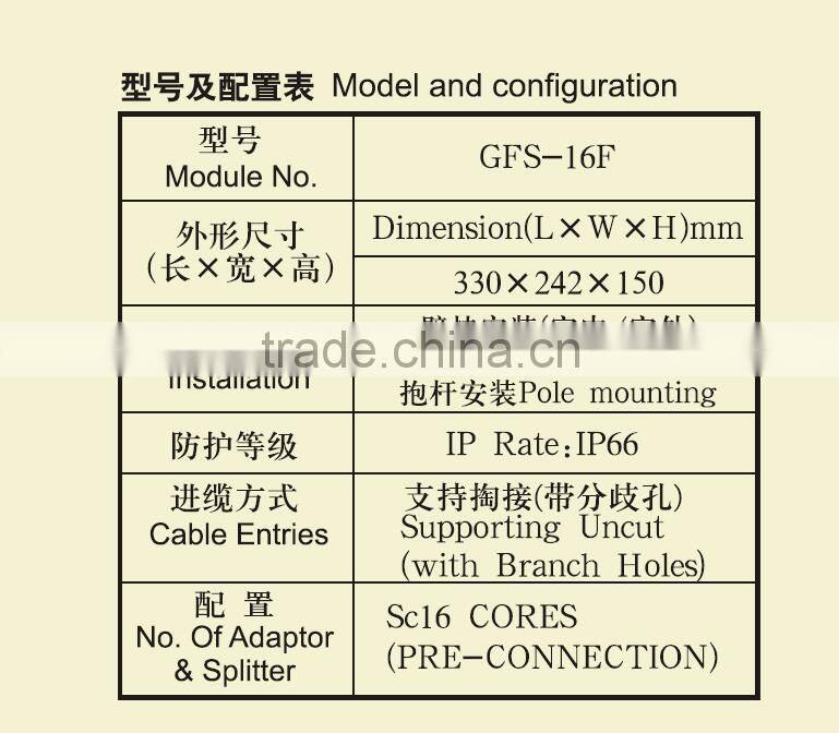 The equipment is used as a termination point for the feeder cable to connect with drop cable in FTTx communication network system. The fiber splicing, splitting, distribution can be done in this box, and meanwhile it provides solid protection and management for the FTTx network building.