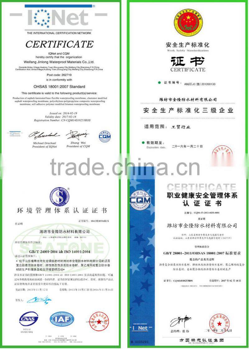 JINLONG produces asphalt shingle, PP&PE/PVC/TPO/EPDM/CPE waterproof membrane, roof underlayment, SBS/APP bitumen waterproof membrane, self adhesive waterproof membrane, waterproof coatings(polyurethane, polyurea etc), pond liner and others.
