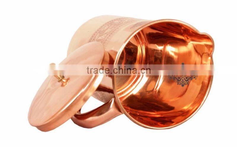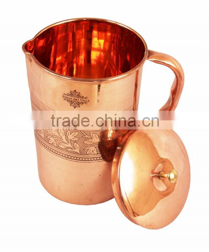 IndianArtVilla Pure Copper Designer Jug Pitcher With Lid 1750 ML - Storage Drinking Water Home Hotel Restaurant Benefit Yoga