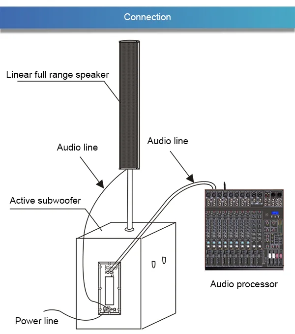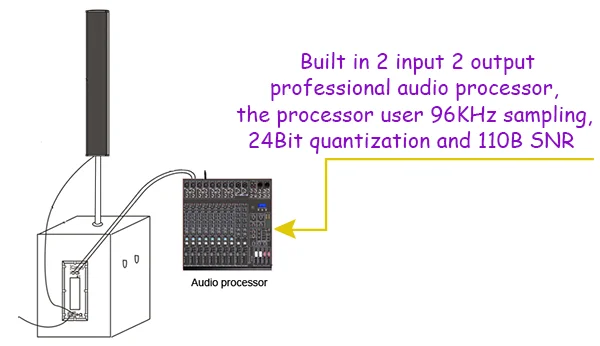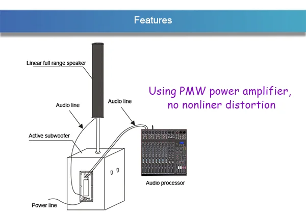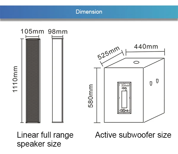13) The subwoofer box is made of plywood in 18mm which is light and treated by wear proof spray; and it’s pasted by dust proof cotton net; the sound box of linear full range speaker is made of brushed aluminum alloy in 3mm which is treated by wear proof spray;