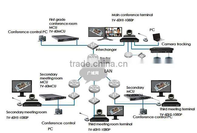 TV-60MCU-16A is a high performance and large capacity multi-point control unit. It supports standard H.323 protocol, H.264 (high profile) codec and H.239 dual stream, and extensive network communication protocols. It is with full HD 1080P/60 terminal and media processing.