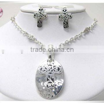 Textured metal cross engraved oval pendant chain necklace earring set .