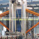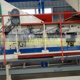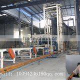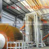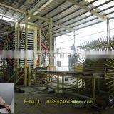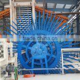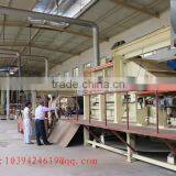 The fiber after drying is transported to the above of forming machine, and uniformly spread on the conveying mesh belt in the way of air-flow. Vacuum box equipped below the mesh belt provides negative pressure and air will be removed via mesh belt, fiber stays on mesh belt and thereafter forms mats gradually. Fluffy mats will be pressed by pre-press. Pressed mats are cut into definite length by longitudinal and transversal saw, then transported to loader passing through accelerating conveyor, storage conveyor and extension conveyor. When finishing loading mats, carriage in the loader will feed conveying belt and mats into hot press, at the same time, shovel head at the front end of conveying belt pushes out pressed board. When carriage comes to terminal, boards have been into unloader, and mats also arrives to due position. Carriage returns, conveying belt turns forward. Mats are in the relative still state and stay on the platen of press when velocity of conveying belt is the same as the returning speed of carriage. Glue in the mats cures, thanks to temperature and pressure in hot press, and hence boards with definite intensity and thickness form. Rough boards will be put on support via unloader. Outfeeding conveyor will unload boards one after another to next section when cage comes down.