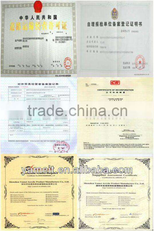 1)Elegant Design 2)With SGS / REACH Certificate for acrylic materials 3)High transparency, being 92%,like crystal, "queen of Plastics" 4)High hardness and luster of surface 5)Good process ability 6)Excellent weather resistance 7)Excellent overall performance 8)Nontoxic |