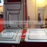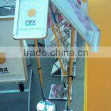 We are a factory specializing in all kinds of display equipments ,including pocket catalogue shelf ,catalogue shelf model FT,L banner ,X banner ,snap frame ,roll up banner ,promotion table and so on .All of our products are of high quality and reasonable price .They haved passed ISO9001 and SGS certification .They are widely used in shopping store ,hotle ,supermarket ,bank and many other crowded places .At the same time ,we offer the OEM, ODM service .