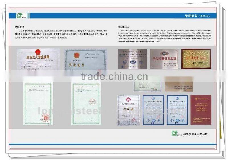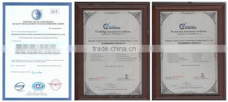 Qingdao Longtai can contract both heavy- duty and light industrial workshops, civil buildings, sports venue, exhibition hall, shopping centers large-span projects and steel frame projects. The annual production ability for main steel structure is more than 20,000 tons, and 2,000,000 square meters for color steel plates.
