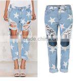 Summer Women Ripped Denim Jean Ladies Middle Waist Loose Fit Stars Printed Vintage Washed Baggy Damaged Jeans Fashion 2016