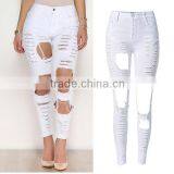 2016 Summer Fashion Women Skinny Narrow Bottom High Waist Jean Pants Ladies Long White Pencil Fit Knee Holes Ripped Jeans Denim