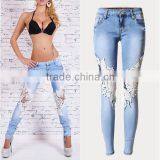 2016 Summer Fashion Women Sexy See Through Jean Pants Ladies Fancy Lace Patchwork Vogue Narrow Bottom New Model Jeans For Lady