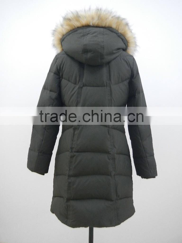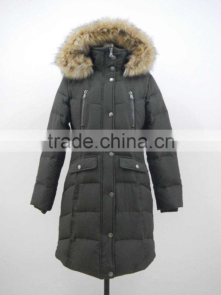 Knee Length Rib Collar Down Feather Womens Parka With Fur Hood