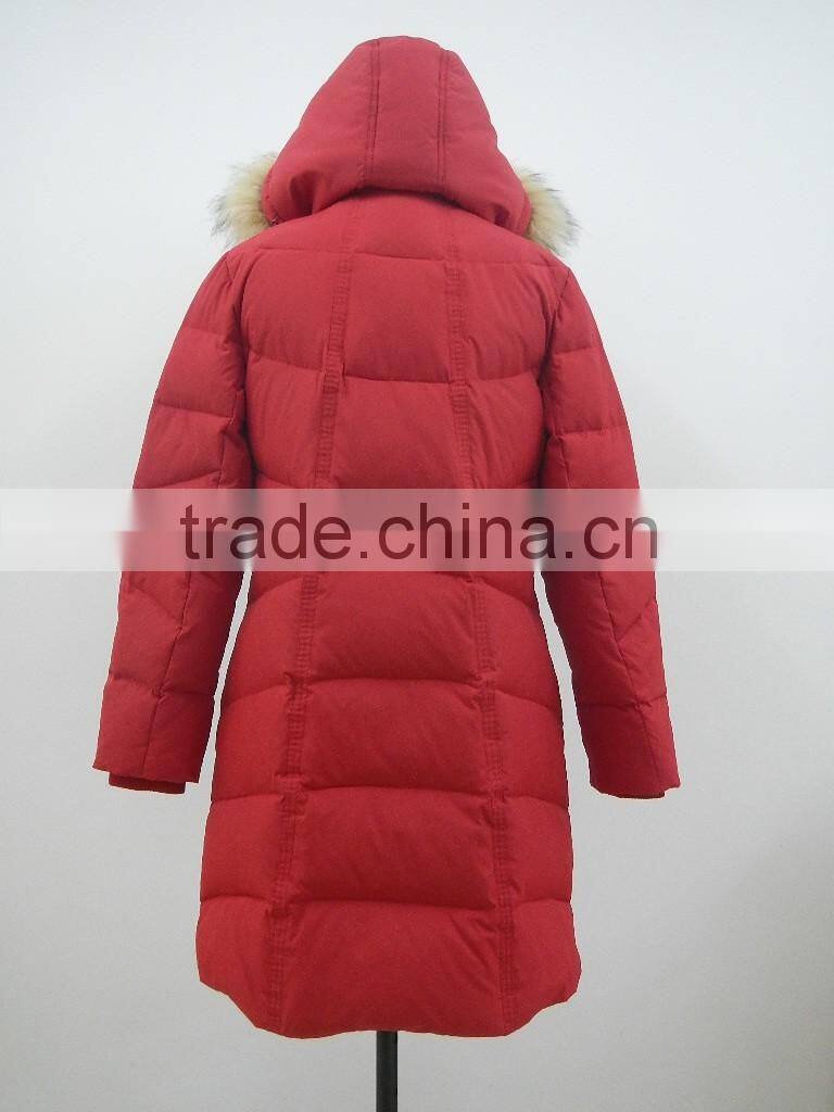 Women Knee Length Duck Down Feather Quilted Puffer Coat With Fur Hood