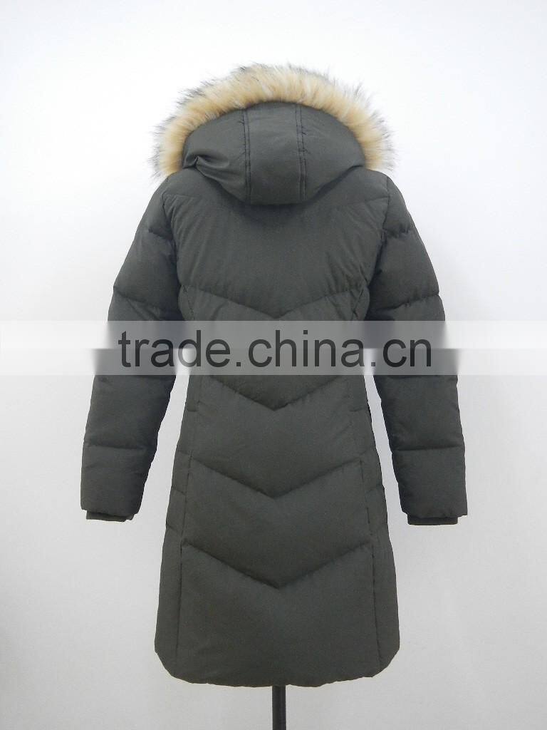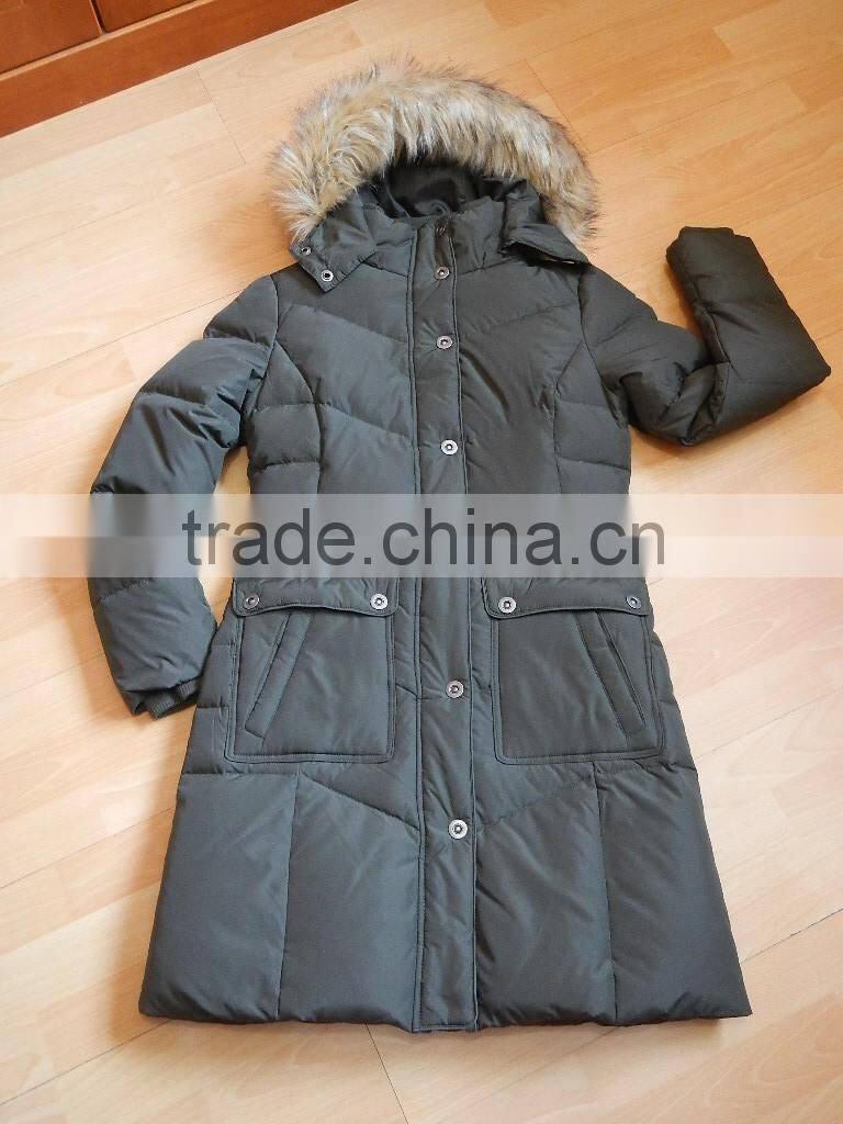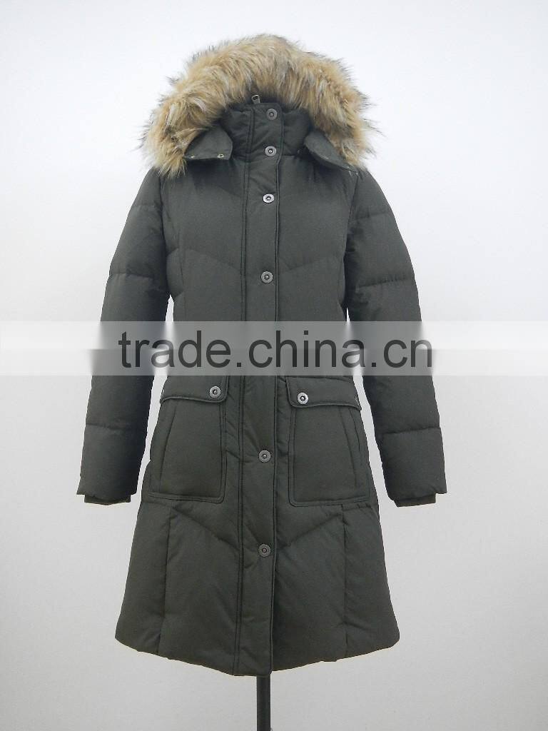Classic design long puffy down coat for women, machine washable (hood hand wash for protecting fake fur trim)