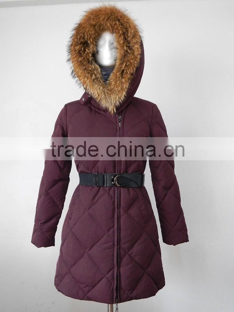 Classic design down coat with real raccoon fur at hood zipper detached, simple and puffy, price without waist belt