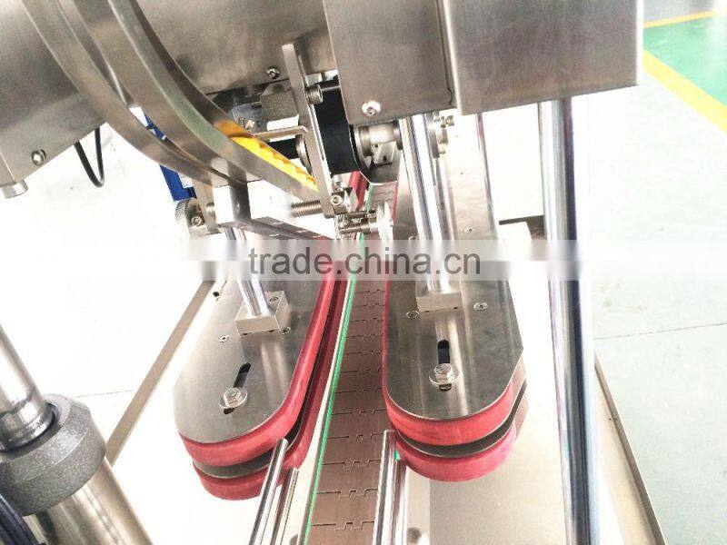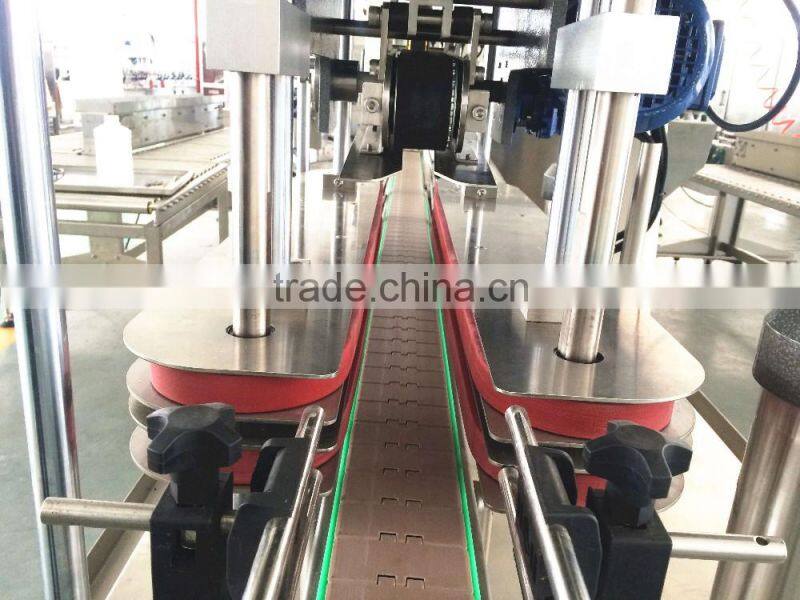 Due to the lid-cover flat belt design have a drop of slop,the caps after press will become more and more tightly.The machine has simple structure,convenient adjustment,production speed fast,high pass rate,after cap pressing has good performance,it suits for cap pressing of foodsutff such as shapes of soy sauce,vinegar,vegetable oil.