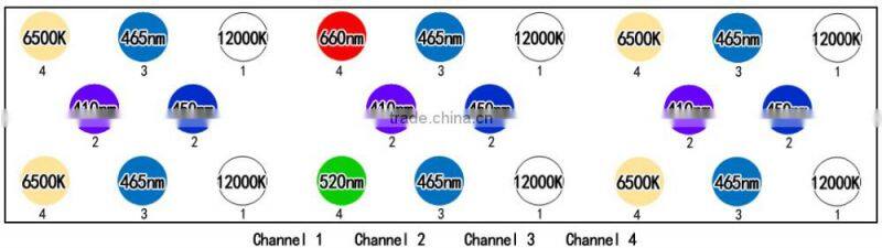 As we test, the 6500K simulates the morning and evening sun; the 12000K is the noon. 410nm and 450nm are night. Combined with 465nm, the sun lighting in 10-20 meter sea is best expressed in your 0.6 meter tank! Of course, a smart programmable controller is best choice unless you can endure a manual way.