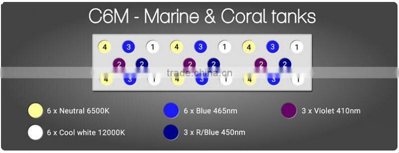 As we test, the 6500K simulates the morning and evening sun; the 12000K is the noon. 410nm and 450nm are night. Combined with 465nm, the sun lighting in 10-20 meter sea is best expressed in your 0.6 meter tank! Of course, a smart programmable controller is best choice unless you can endure a manual way.