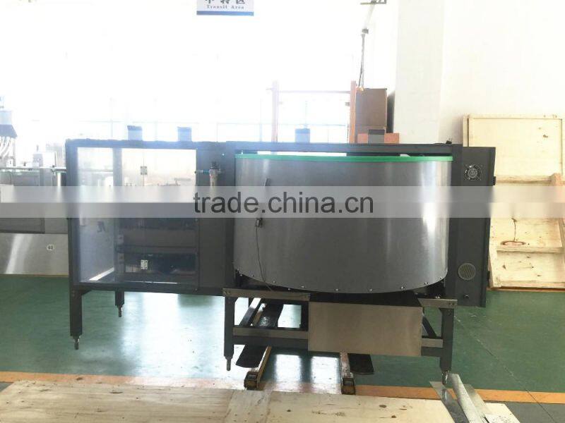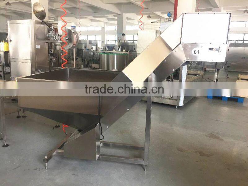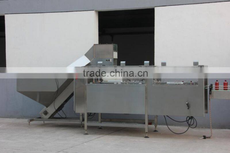 The machine combines the bottle infeeder machine and unscramble bottle machine.It can be used with filling production line.It can make the all direction of the bottles to through the rotating disk in the same direction.After folders bottle belt reversal then be arranged to the conveyor line.The machine do not need to have someone to poerate.It need to keeping add the bottles.The machine performance is stable,unscramble bottle fast.It only need 5-10 minutes to change the bottle type.The fast speed of unscramble bottle can get 12000 bottle/hour.It can thoroughly solve the problems of the slow speed,strenght by people.