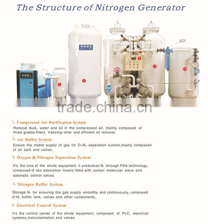 HUILIN Nitrogen Generator produces the high-purity N2 preponderate over 99.9995% in one-time, which depends on the professional molecular sieve and special high-purity technics flow