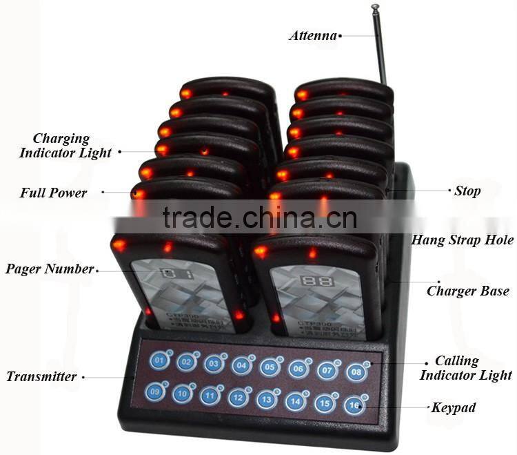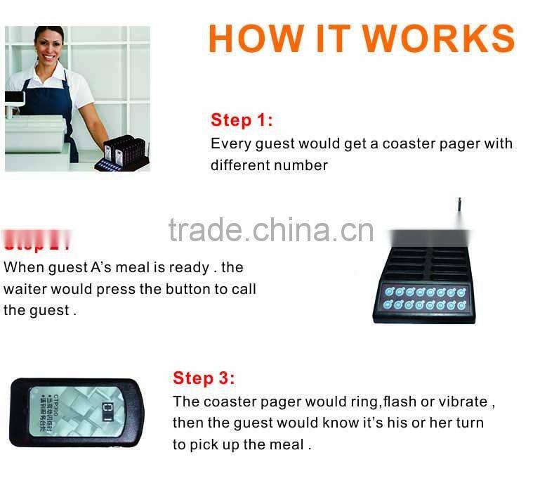 Wireless restaurant pager system is made of transmitter and receivers,it is very convient to operate and help you do a lot of work .it is faster than waiters.