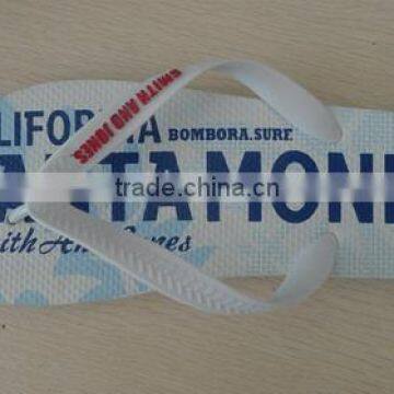 Purchase promotional flip flops for your next summer promotional giveaways, great for beach and features embossed imprinted outsole and printed insole. RoHS certified budget flip flops match Euro standards.