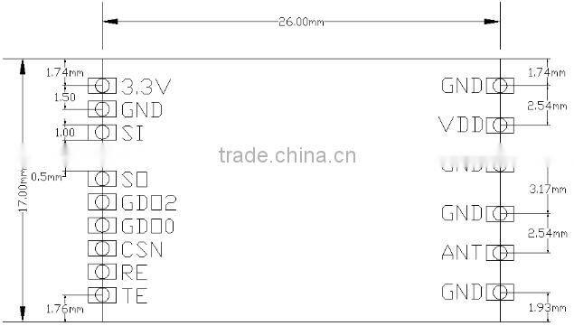 6. The module’s pin GDO0 and GDO2 are general digital I/O ports, they can be programmable to produce trigger signal or clock output.