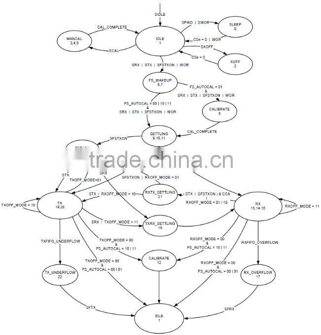 CC1101’s operation states contain: Sleep State, Idle State, Active State,Sleep State is the lowest power mode. After wake up from Sleep State, the module get into Idle State. Except the Sleep State, each state can be switch by SPI interface, also programmed to auto-switch. CC1101’s radio control state diagram is shown as below, for detail information in the CC1101 datasheet.
