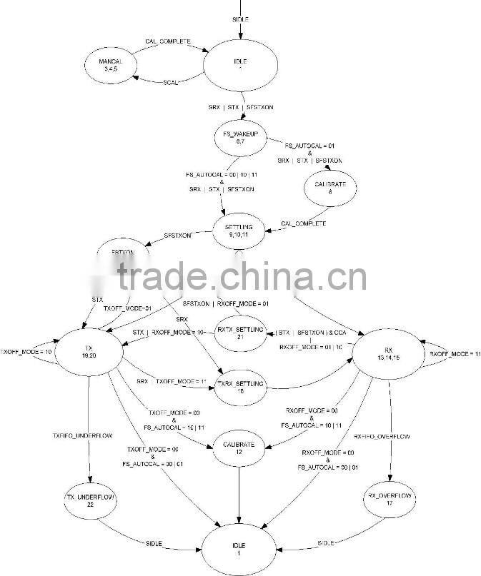 CC1110’s operation states contain: Sleep State, Idle State, Active State,Sleep State is the lowest power mode. After wake up from Sleep State, the module get into Idle State. Except the Sleep State, each state can be switch by SPI interface, also programmed to auto-switch. CC1110’s radio control state diagram is shown as below, for detail information in the CC1110 datasheet.
