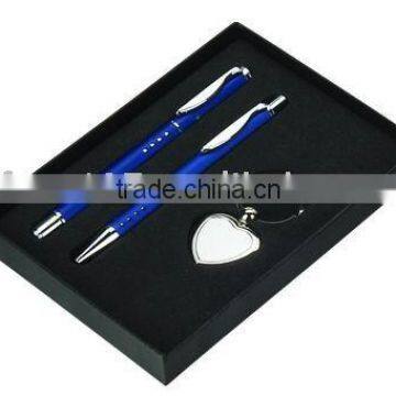 this gift set includes twin pens and keychain. You also can change other suitable styles for the set. Any color available.business gift set packed in a black gift box