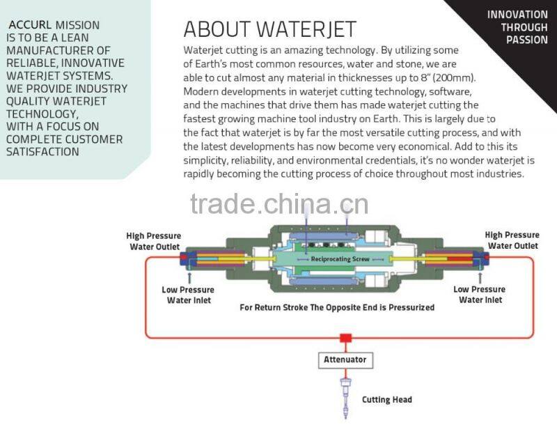 The ACCURL® abrasive water jet machine is a high-pressure waterjet machine that utilizes straight water cutting or abrasive waterjet cutting to cut several types of material. The ACCURL® is a heavy-duty precision, ground ball screw designed system for maximum precision and rigidity. The ACCURL® is built to the most stringent standards in the machine tool industry. .