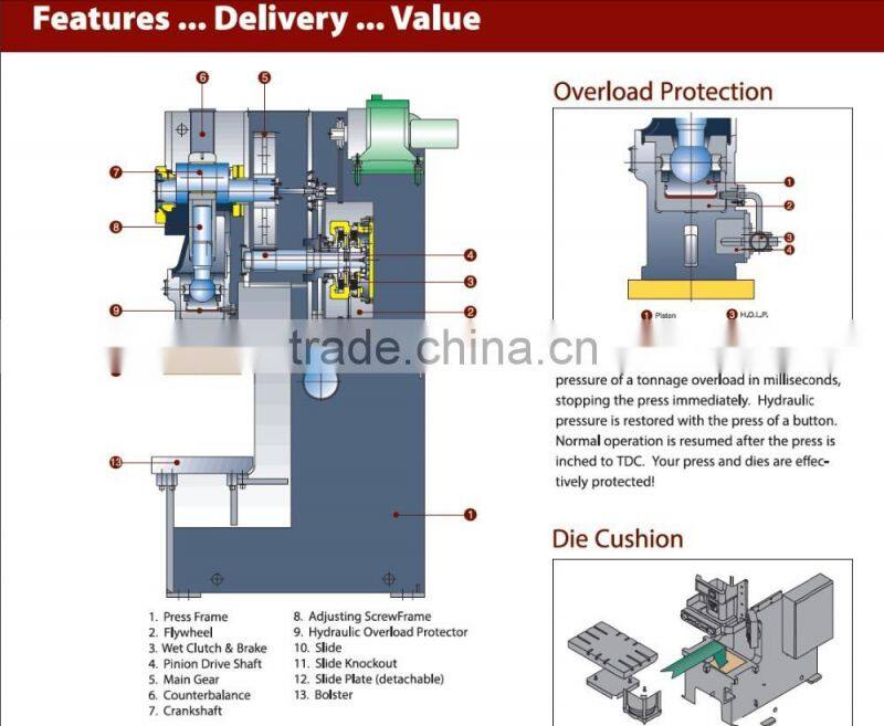 The JH21- 200 ton GEN-2 (left) shows our standard I-PRESS control, side safety guards, t-stand run station and t-slotted bolster and slide for quick clamping of dies.