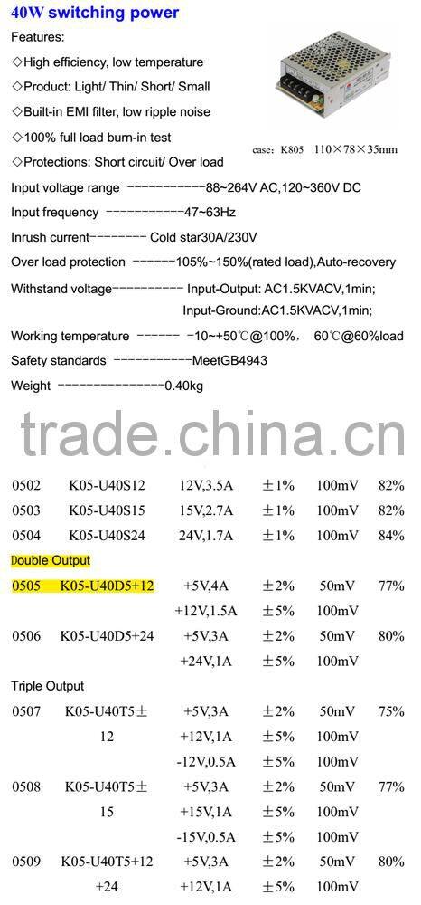5v4a 12v1.5a Dual output switching power supply 40w smps power supply for permanent makeup digital machine