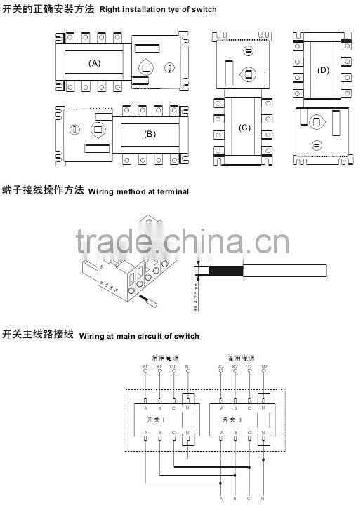 The switch equipment could perform the full automatic operation, compulsively setting "0" remote control and emergency hand operation, moreover, it could perform detection and protection for phase lack, detection and protection for undervoltage, detection and protection for frequency, delay adjustment and electrical & mechanical interlock, etc.