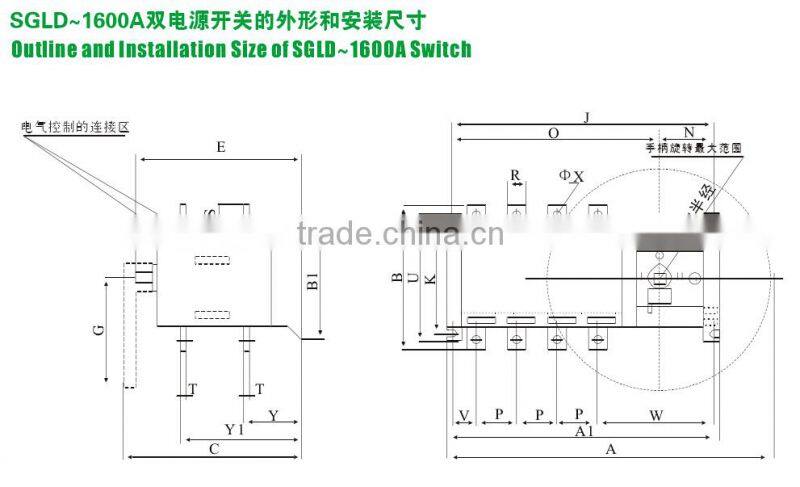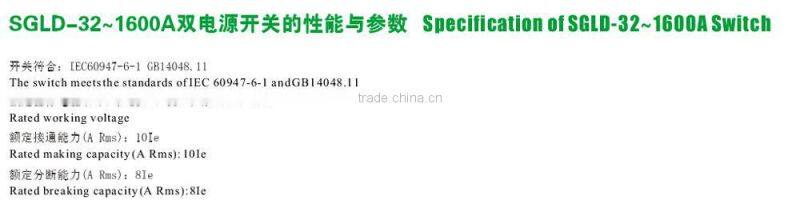 The series SGLD automatic transfer switch equipment (ATSE) is such a new product that integrates switch and logic control to truly realize the mechatronics; it applies at the distribution device of rated insulation voltage up to 1000V and rated frequency of 50Hz and rated voltage up to 660V and conventional heat current up to 3200A. to automatically transfer between the master power and the backup one in the power supply system or the two load devices and perform the secure isolation, wide used at the important occasions, e.g. hospital,marketplace,bank,highrise building,coal mine,communication department,iron mine,expressway, airport, product line and military facilities where the power interruption is taboo.