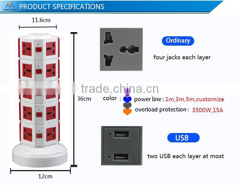 1.Independent control: Each layer has a independent switch and indicator light, making the control much easier and clearer. 2.Universal interface : Adopt universal interface ,which can fit 99% of the whole world. 3.Intelligent USB: Apply to more than 99% digital and electronic products in market. For example: mobile, tablet, digital camera and so on. 4.Take-up base The innovative design can achieve the function of retracting the power cord. the redundant power cord will won't influence the beauty. 5.Reliability power line 6.Overload protector when the excessive current situation, the over current protection device will automatically power off. | |