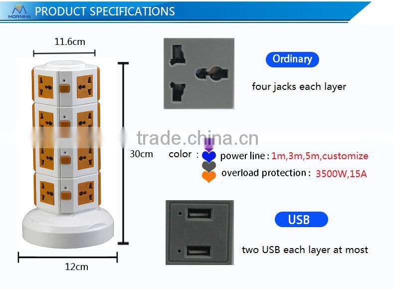 ME-S3 Three Layers Overload Protection Power Extension Tower of Vertical Rotary Socket With 1-3 Meters Power Line and 0-4 USB