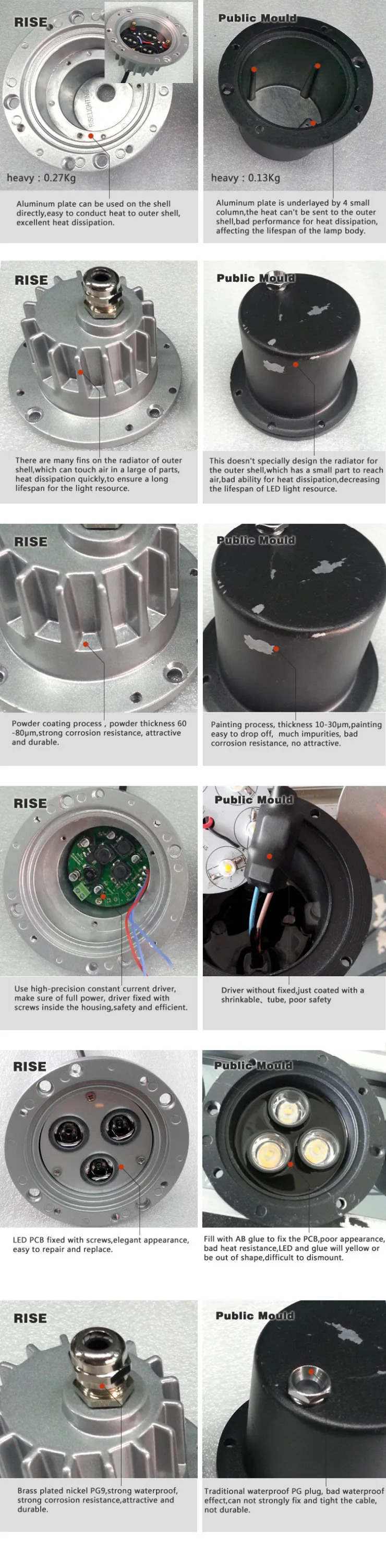 Rise LED Inground Light use high quality die-casting Aluminum, weight is 0.27KG, Aluminum plate can be used on the shell directly, easy to conduct the heat to outer shell, has excellent heat dissipation.