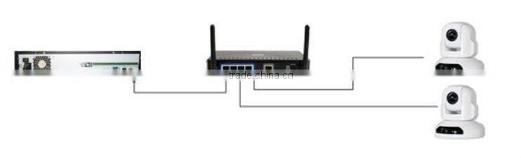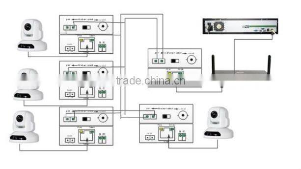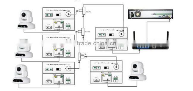 Using a coaxial cable with BNC tee, it is very convenient way to achieve a simultaneous transmission of four pieces network HD cameras by one video cable. Transmission distance can be extended up to 2000 meters while breakthrough the problem of twisted pair transmission and easier construction. (It can be created a new project, also used for the existing transformation of traditional analog cameras project);