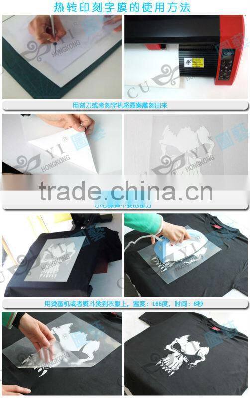 heat transfer vinyl can be cut by a vinyl cutter to print name, number, logo and design on T-shirts, sports wear and other garments by a heat press machine.Its soft hand, strong adhesiveness, excellent durability and washability are specially engineered for applying to T-shirts. heat transfer t-shirt vinyl