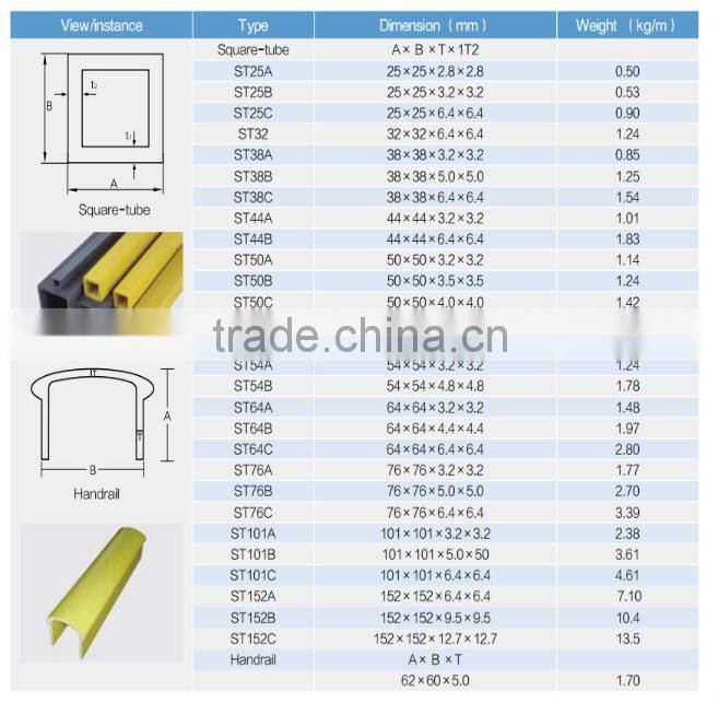 Series of our pultrusion profiles include square tube, rectangular tube, round tube, angel, I-beam, Channel, rod and other custom profiles. After proper combination and connection, they could be widely used in many fields such as: FRP grating platforms, Walkways, ladders, guardrails, supporting structures of cooling tower, sporting profiles, tool handles and other load structures, etc.