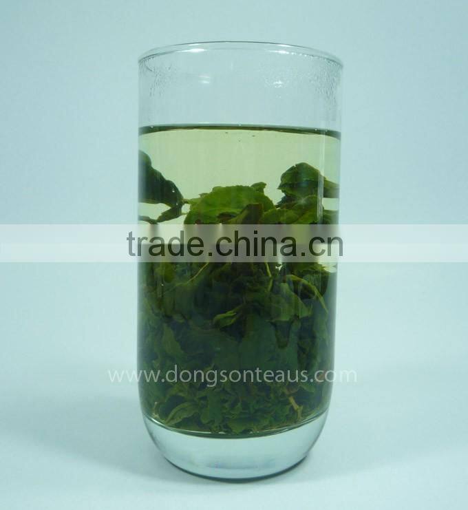 Shape of our green tea is similar to oolong tea , it's every baller like oolong tea, very convenient for packing and shipping, no bran tea, the taste is great, when you make green tea with a glass cup, looks very nice tea leaves, each leaf intact not torn. tender and three greens". "One tender" refers to tender tea leaves, and "three green" refer to the green colored tea leaves, the green colored tea liquid and green colored tea dregs.